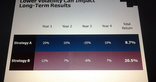 As illustrated in the chart below, under Six Sigma Wealth Advisors Strategy B , “Lower Volatility Can Impact Long-Term Results” *, Strategy B demonstrates that in the medium to long term avoiding large draw-downs is much more important to building portfolio value than achieving large gains. The clear winning strategy is to avoid large losses and aim for the steady accumulation of more modest gains.